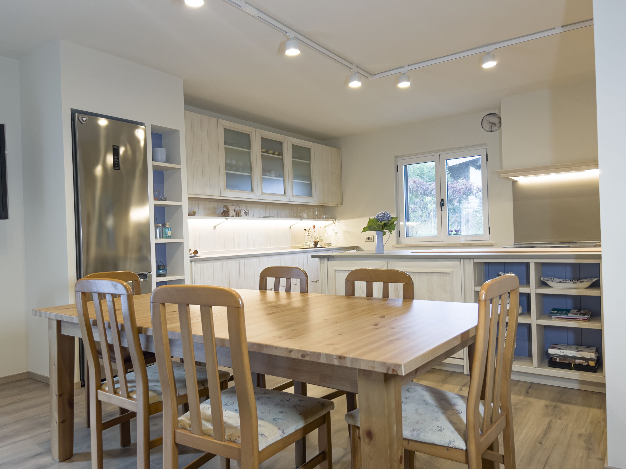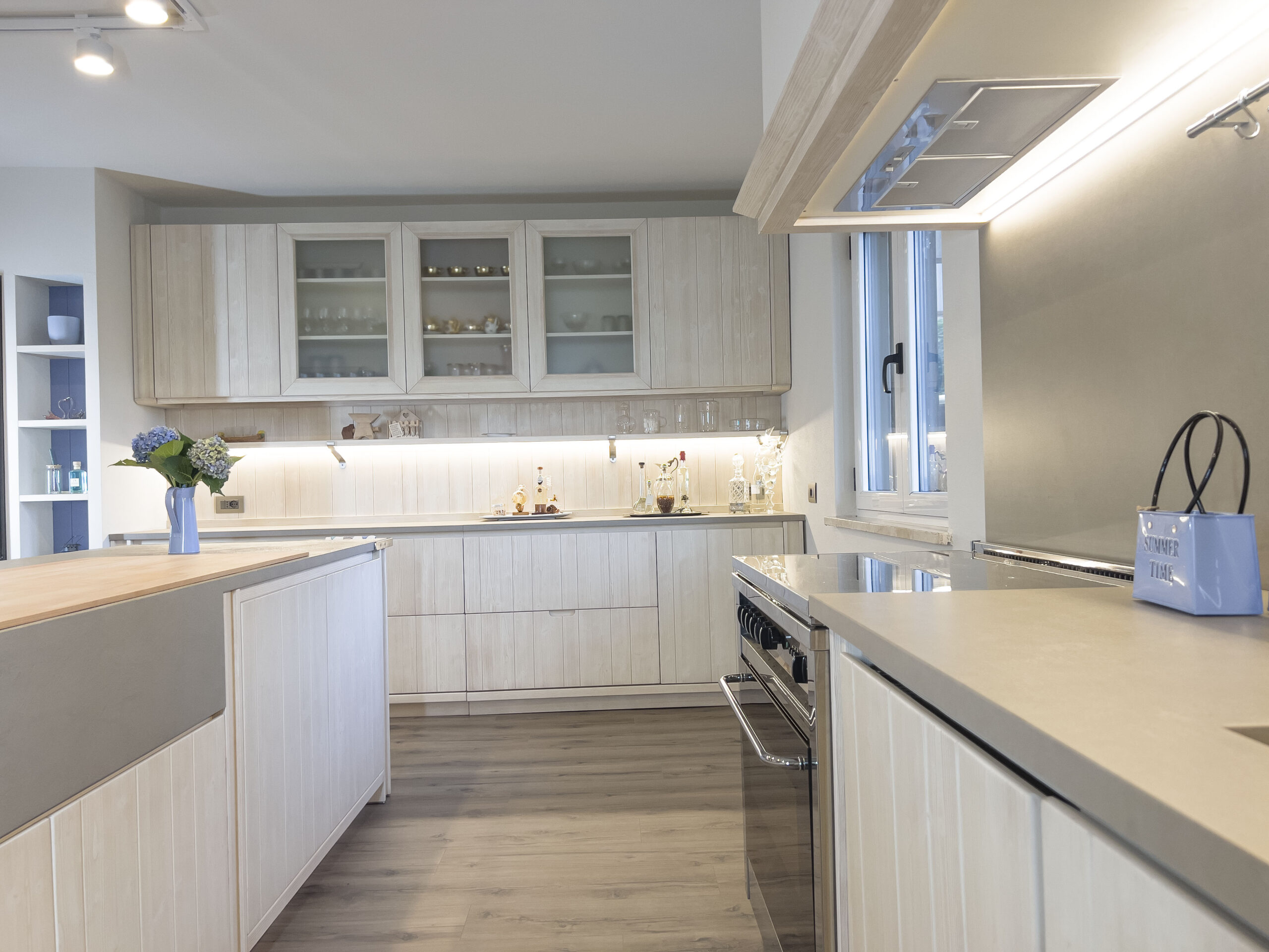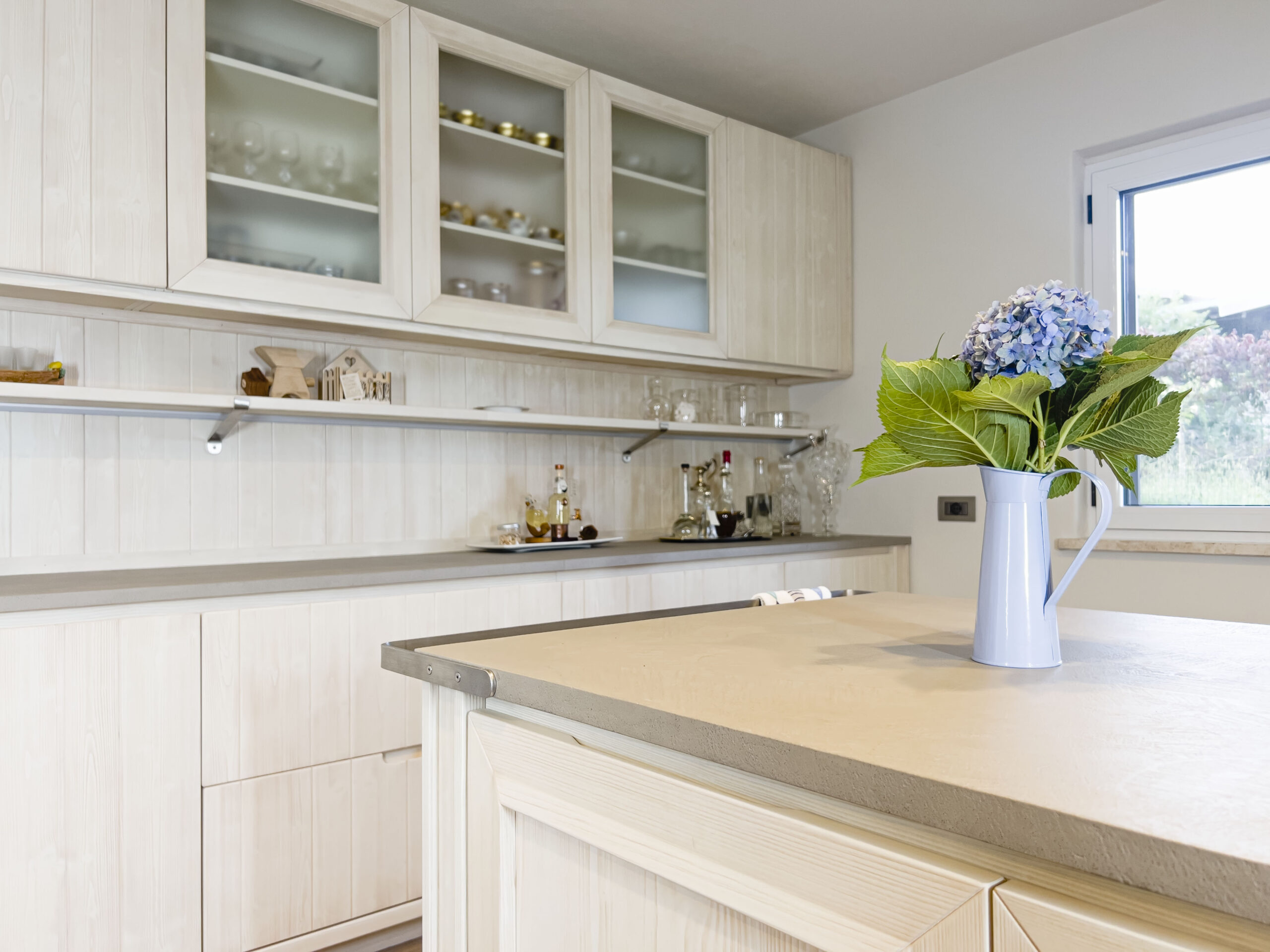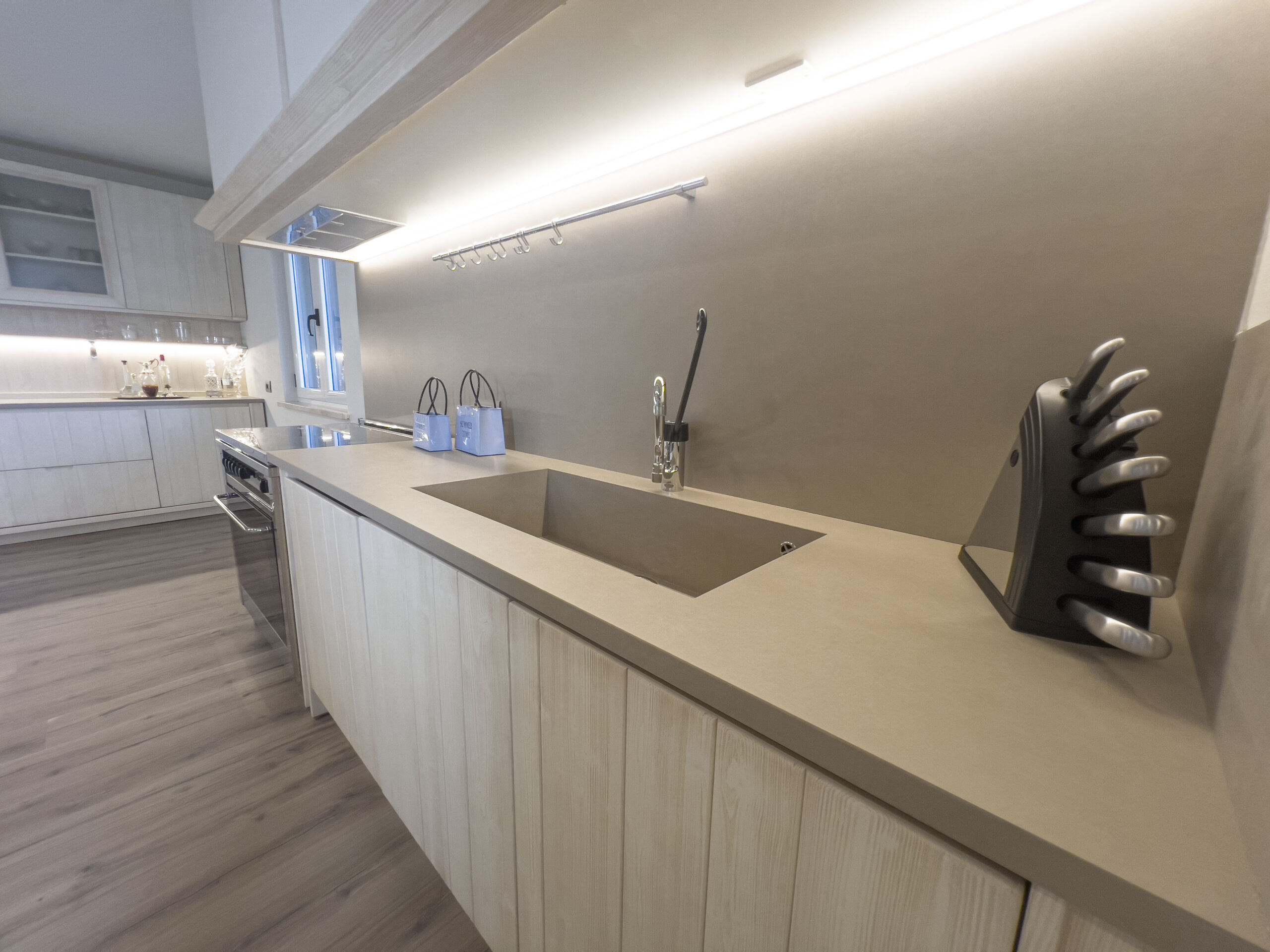 • Un’Isola Multifunzione con Tagliere Dedicato: Il grande piano di lavoro in legno chiaro (visibile nelle immagini) non è solo un punto d’appoggio, ma ospita un’area specifica con tagliere incorporato, ideale per la preparazione della pasta fresca e altre attività culinarie che richiedono spazio.